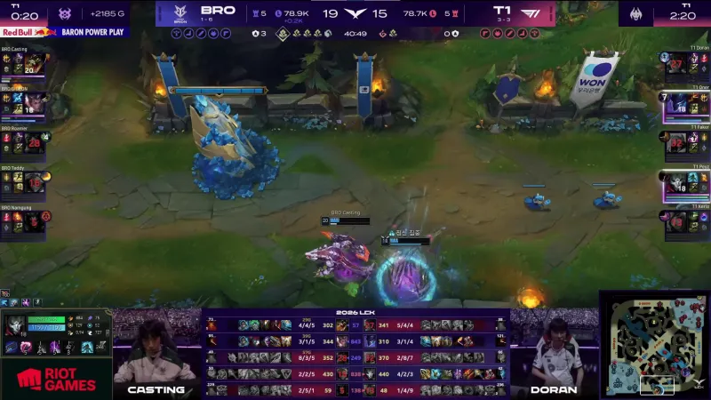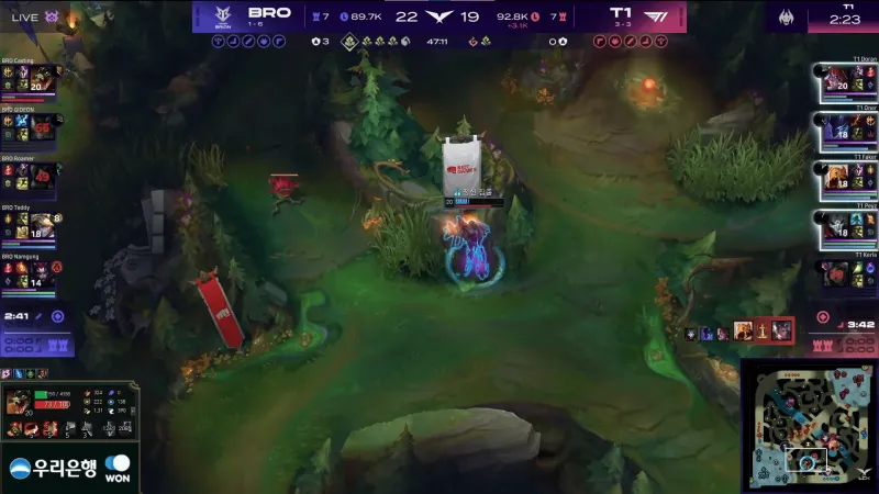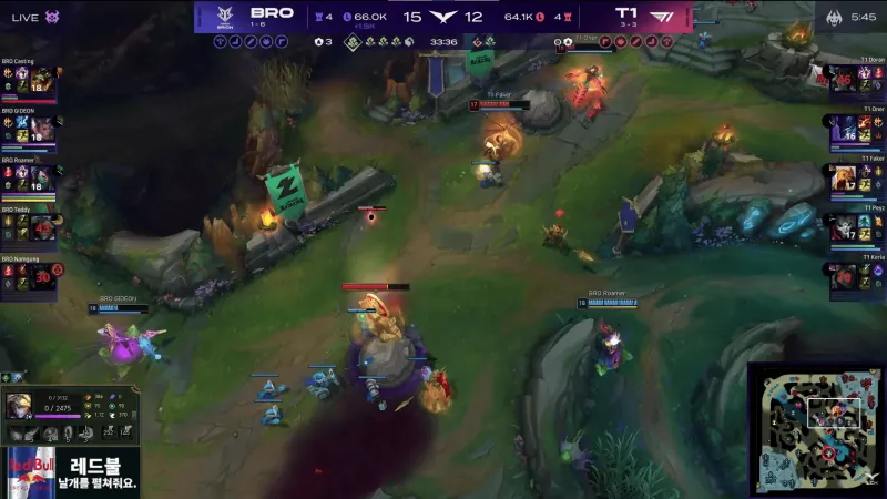比赛第22分钟,两队爆发小龙团,BRO鏖战打出3换3打退T1。